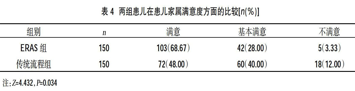 2.4两组患儿在患儿家属满意度方面的比较 ERAS 组家属满意度高于传统流程组(P<0.05),差异有统计学意义,见表4。