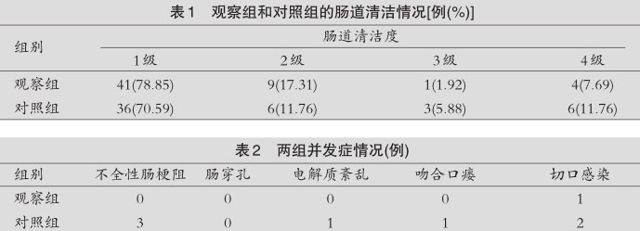 并发症:在本研究中,主要观察在术前肠道准备的过程中,有无发生一些相关的并发症,如完全性肠梗阻、肠穿孔等。