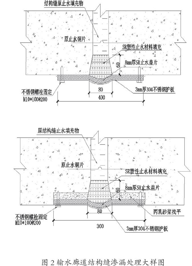 采取“嵌、封、排”的综合处理措施,即“SR柔性止水材料+SR盖片+不锈钢保护盖板”。主要步骤为表层处理→凿槽→嵌填止水材料→安装防渗保护盖片→安装不锈钢盖板。