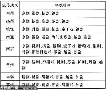 另外,从统计表格中我们还可看出,在每个区域里都流传着四种以上的剧种类型,这些剧种在其区域里的流传面却又各有侧重,如徐州地区是以江苏梆子戏和柳琴戏的流传为主,淮安更多流传的是淮海戏和淮剧,昆剧和锡剧又更受苏州、无锡、常州地区观众的欢迎。为了更清楚的看出每个区域里流传的剧种情况,我们在上面所列统计表中将其主要流传的剧种用斜体字做了标明。