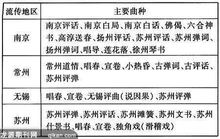 省内说唱音乐曲种主要有:苏州弹词、苏州滩簧、苏州文书、无锡评曲、南京白局、扬州弹词、扬州清曲、拜香亭、淮海锣鼓、清淮小曲、徐州琴书、徐州大鼓、徐州丝弦、渔鼓、渔鼓坠子、宣卷、说因果、花鼓、唱春、小热昏、独角戏(滑稽戏)等。其中,有说有唱的曲种主要有苏州弹词、扬州弹词(也称弦词)、琴书、大鼓书、渔鼓道情、锣鼓书等;只唱不说的,主要有扬州清曲、南京白局、徐州丝弦、海州宫调牌子曲、盐城大唱、清淮小曲等;此外,还有与宗教活动有关的宣卷(讲经)、说因果、童子书等,[注:参见江苏省地方志编纂委员会编著《江苏省志·文化艺术志》,江苏古籍出版社,2003年版,第123页。]则也是说、唱兼备的特殊曲种。除说唱类曲种外,上述地区还流传一些只说不唱的曲艺品种,主要有扬州评话、苏州评话、徐州评词、南京评话等,尽管这些曲种不包含唱腔等音乐因素,但为了通观各类曲种的地域分布,本文统计中仍将此类一并纳入各地曲种之中。